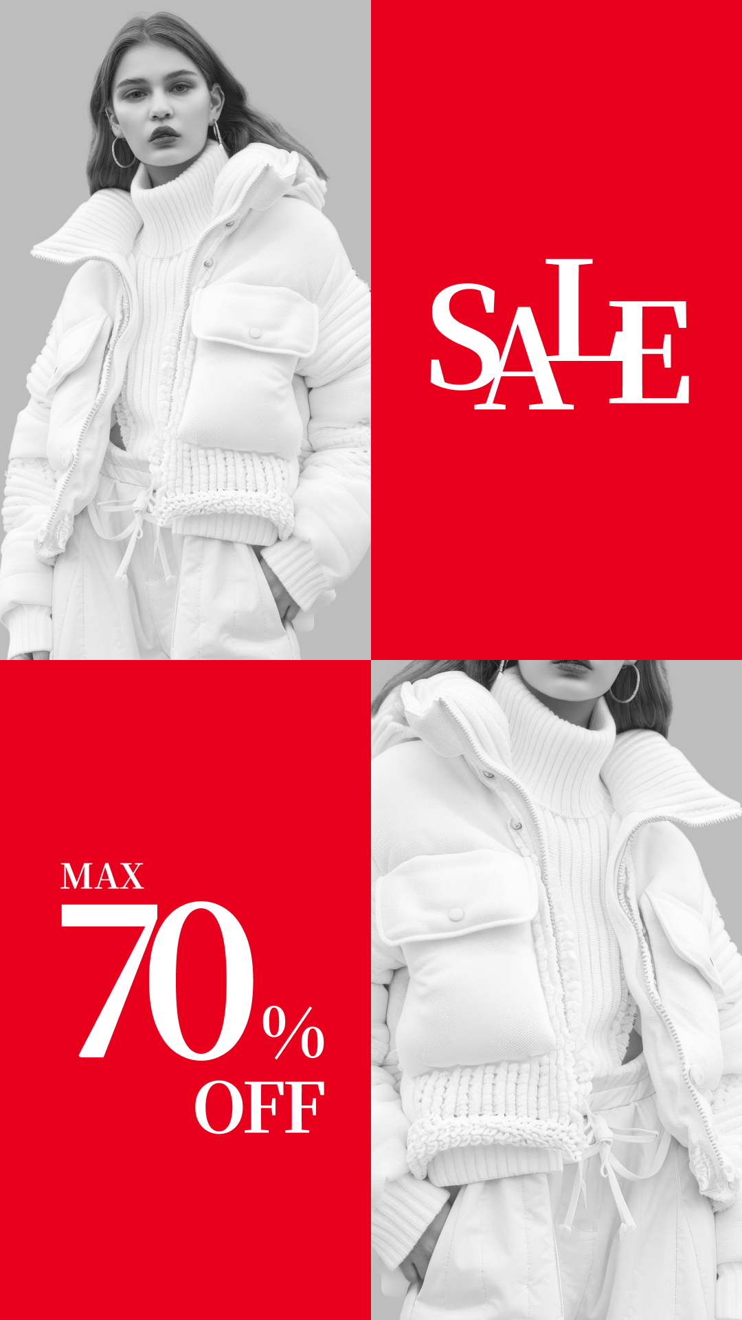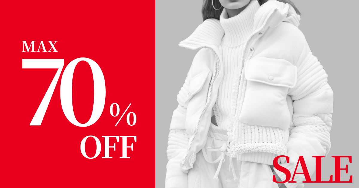 「SALE」「70%OFF」のキャッチコピーが一目で伝わるように配色を考えました。